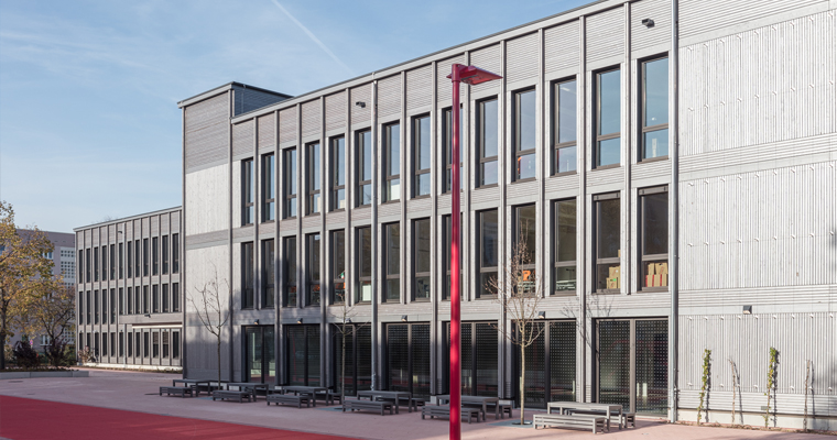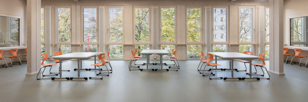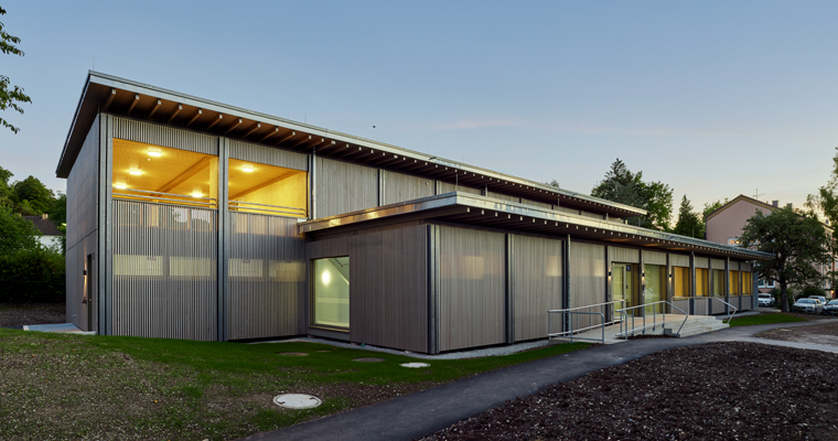 Bauhausstil in Holz; die Fuchshofschule bietet vielen jungen Menschen nachhaltig erbauten Lern- und Lebensraum.